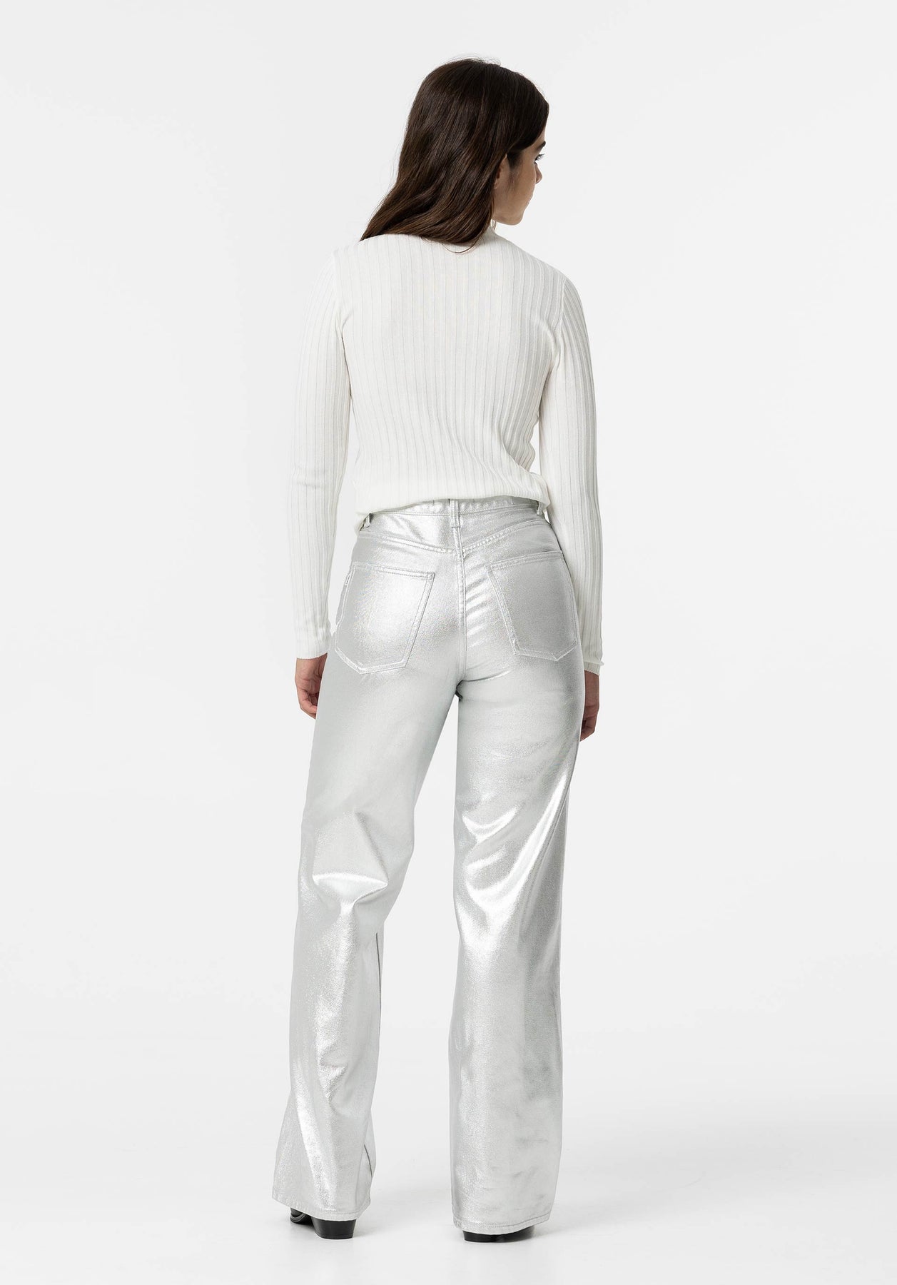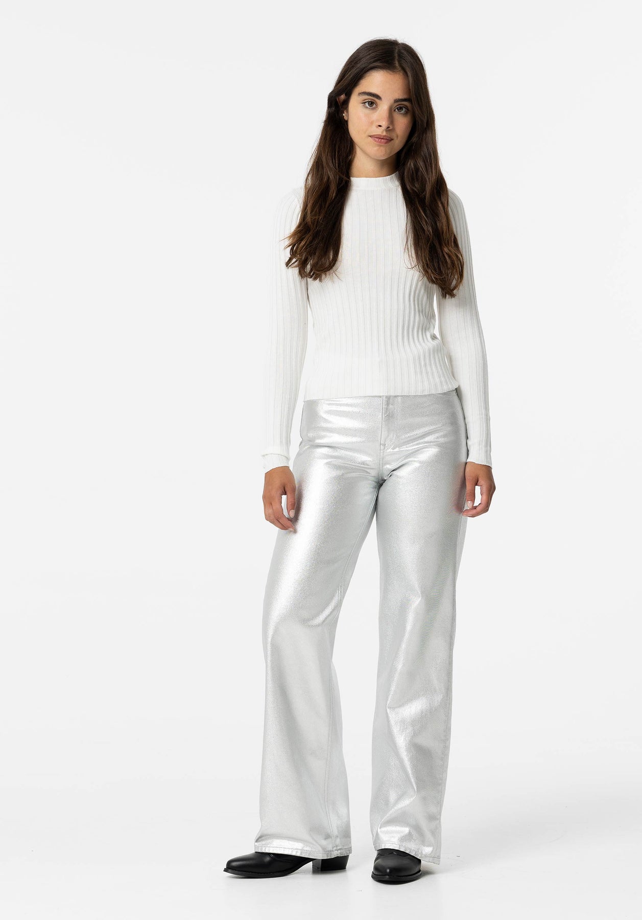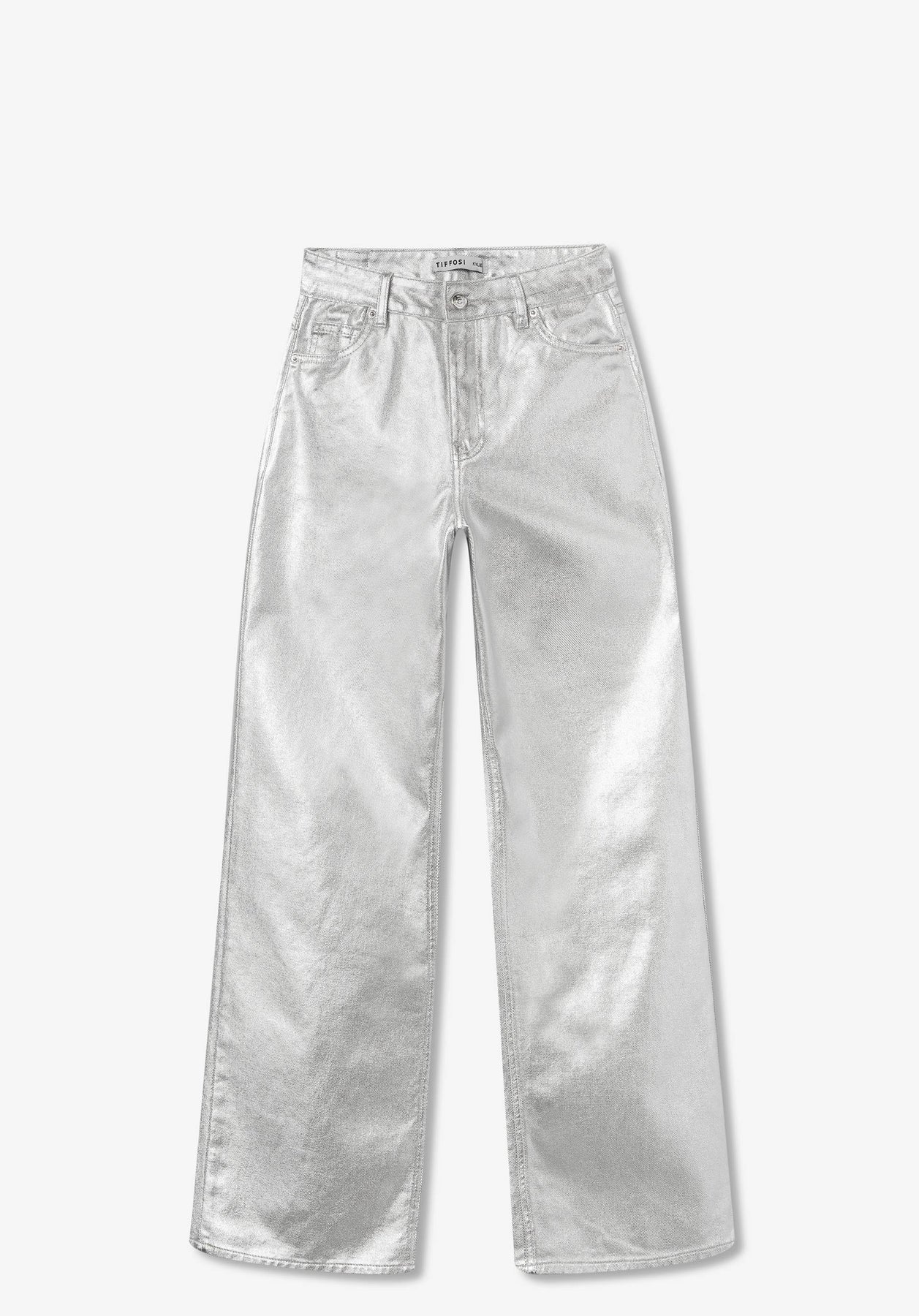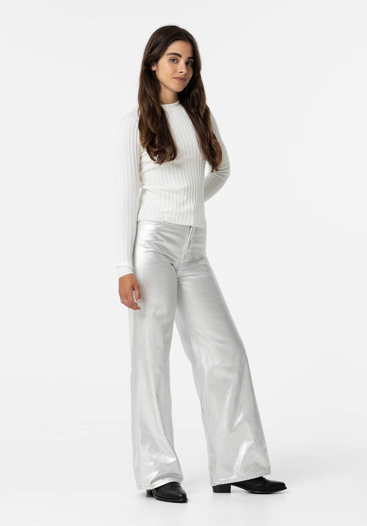 Jeans con pierna ancha de tiro alto con cinco bolsillos. Cierre frontal con cremallera y botón metálico.