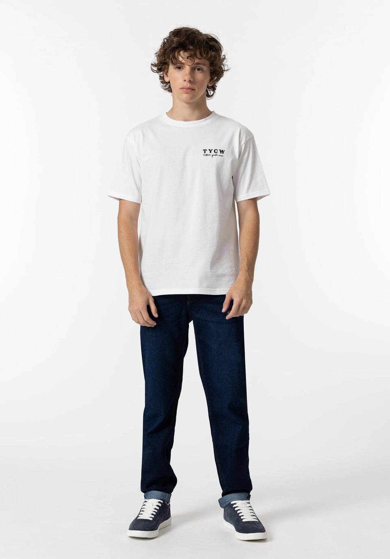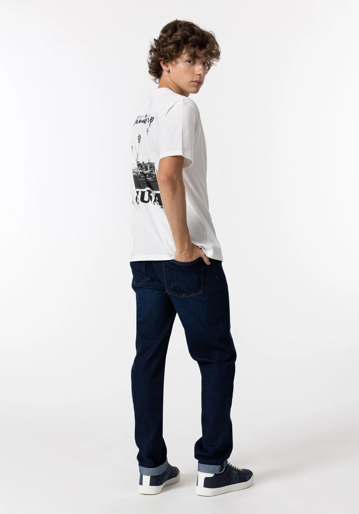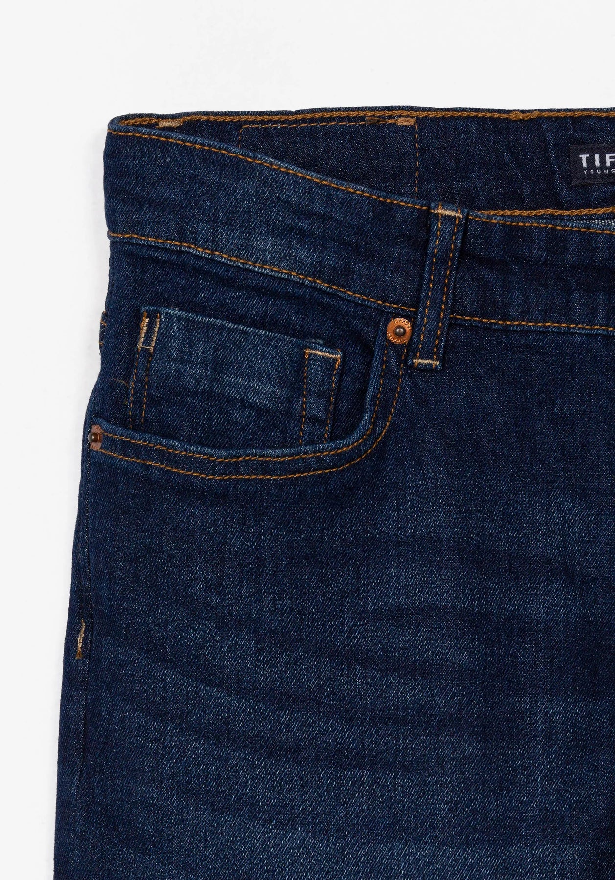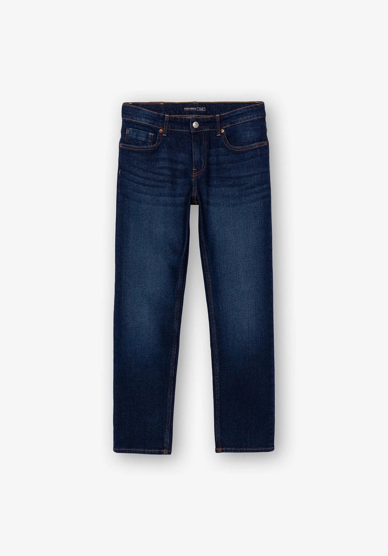 Jeans straight fit con cinco bolsillos. Cierre frontal con cremallera y botón metálico.